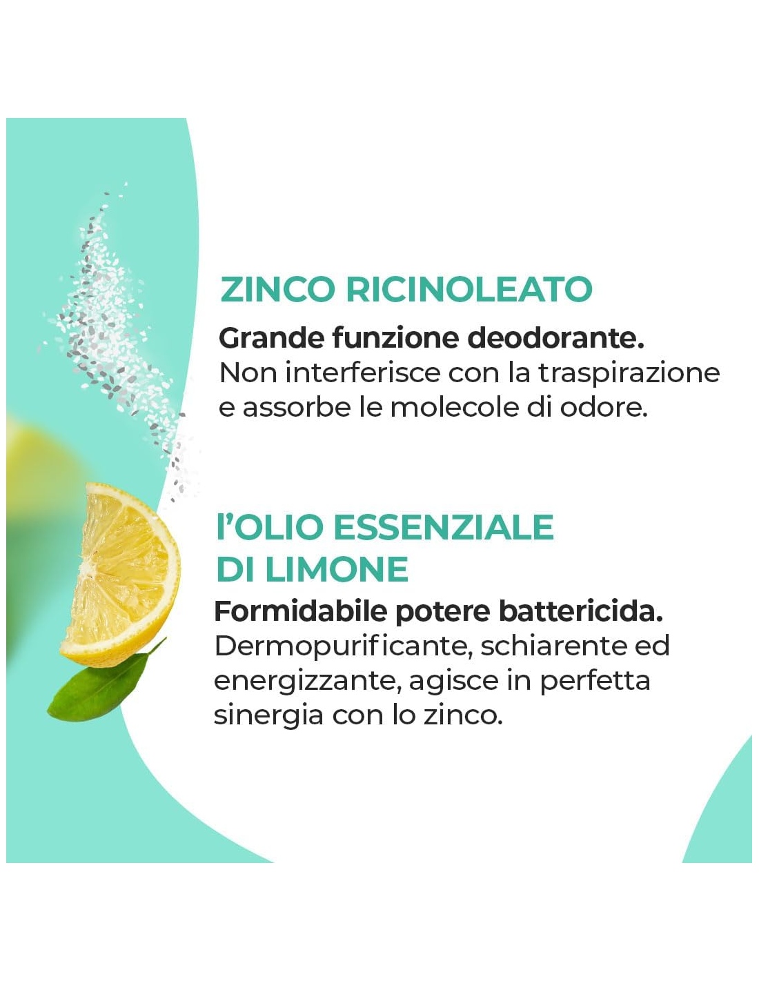 ✔️ Azione deodorante – Lo zinco ricinoleato aiuta ad assorbire i cattivi odori senza bloccare la naturale traspirazione.