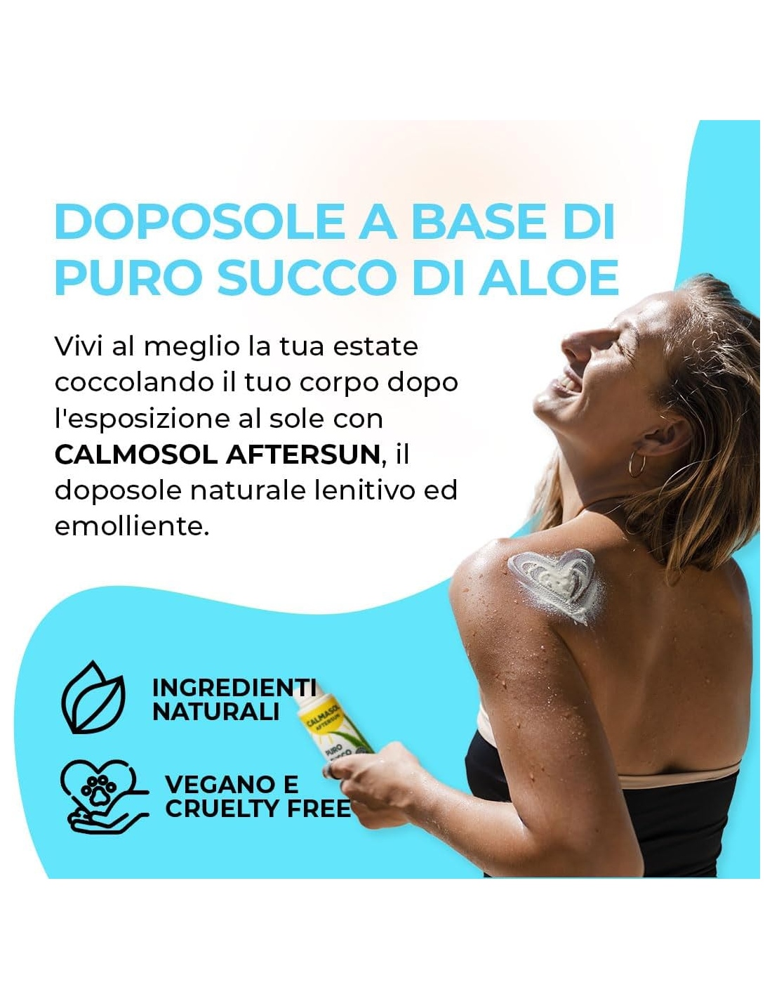 - Lenisce la pelle: l’aloe vera ha proprietà lenitive e rinfrescanti che possono aiutare ad alleviare l’irritazione e il rossore causati dall’esposizione al sole. Applicare CALMASOL sulla pelle dopo l’esposizione al sole può contribuire a calmare la sensazione di bruciore e a ridurre l’infiammazione.
